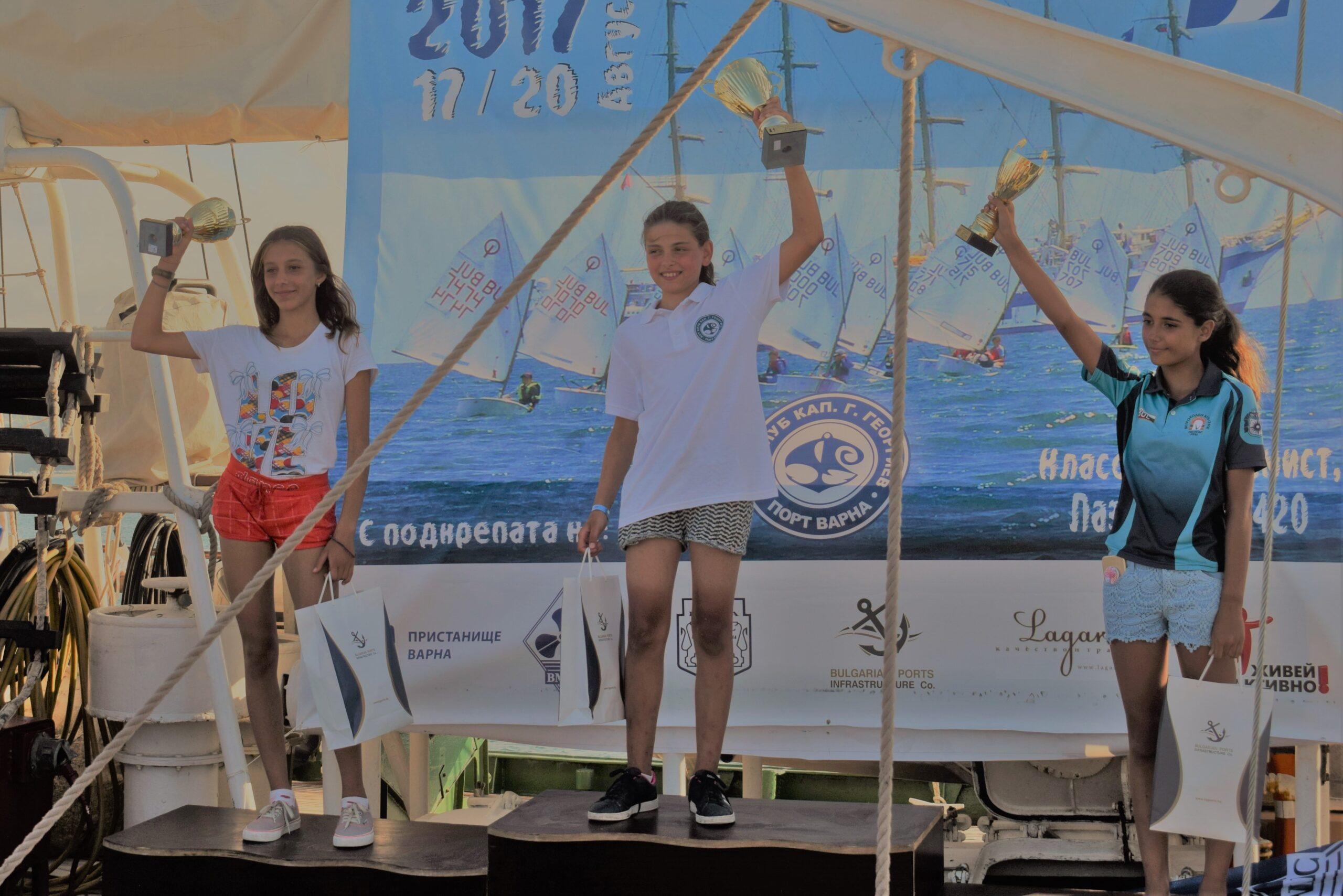 The Head of Public Relations and Protocol Dept. to Bulgarian Ports Infrastructure Company Ms. Mariela Ganchovska leaded the official award ceremony in the 42nd edition of Regatta “Port Varna” for children and adolescents. The event took place on 20 August 2017 in Varna on board the symbol of Bulgarian sailing – the ship Kaliakra. Thus with lots of children’s smiles and happy emotions successfully completed the disputed contest in class Optimistic, Laser 4.7 and 420.